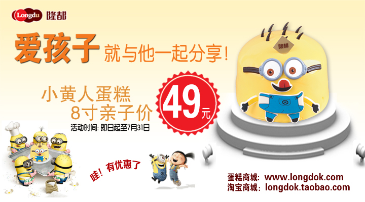 宝贝,来份隆都西饼屋“小黄人蛋糕”吧!亲子特惠,8寸亲子价49元/个(活动日期:即日起至7月31日)